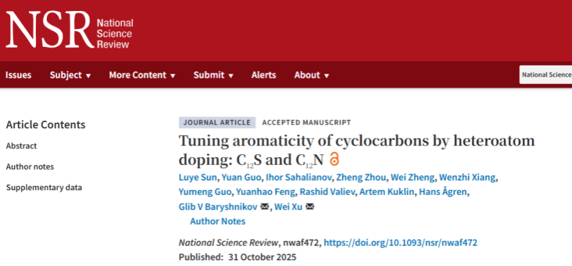 10月31日,《国家科学评论》(National Science Review)在线发表了同济大学材料科学与工程学院许维教授团队与瑞典林雪平大学、芬兰赫尔辛基大学及瑞典乌普萨拉大学等国际合作团队的最新科研成果“Tuning aromaticity of cyclocarbons by heteroatom doping: C12S and C12N”。该研究利用扫描探针显微技术,成功合成了两种杂原子掺杂的环型碳:C12S(硫掺杂环型碳)和C12N(氮掺杂环型碳),并结合理论计算揭示了它们在芳香性上的根本差异。