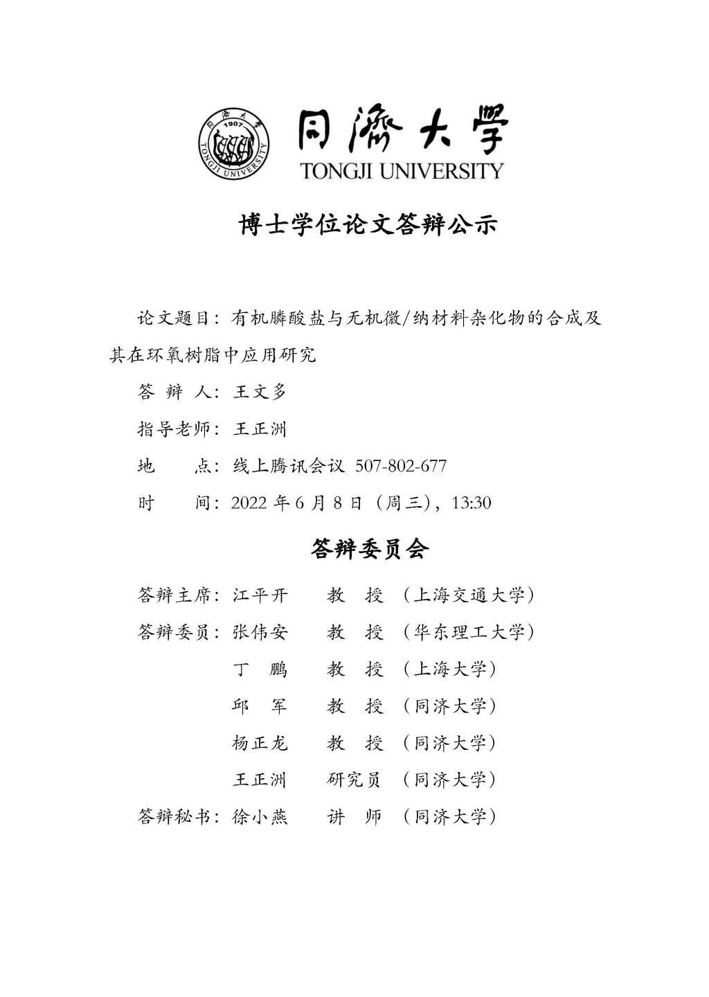 王文多(博士)学位论文答辩公示